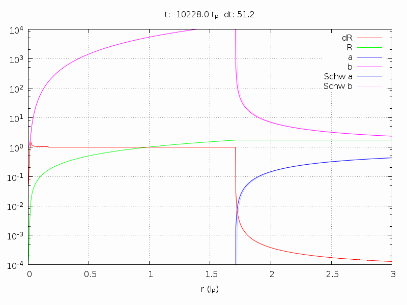 Numerically, we can find an approximate solution for this by simulating the time-reverse of evaporation, with infalling light. The following animation shows such an evaporation simulation compared to the disappearing point mass approximation. As you can see, the approximation is excellent all the way down to holes with planck-length radii.